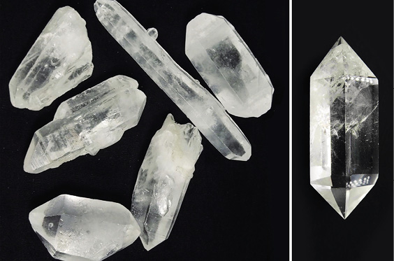Fig. 2. A sinistra, cristalli naturali di quarzo ialino; a destra, esemplare levigato (5.2 × 1,6 × 1,6 cm, ca.). In entrambi i casi è evidente la morfologia prismatico-esagonale con terminazioni piramidali, tipica della specie.