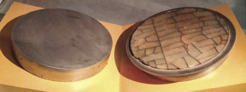 Fig. 3. Trasduttore risonante a sandwich di quarzo progettato da Langevin, aperto per mostrare il mosaico di lamine di quarzo interposto tra due piastre di acciaio. Esemplare appartenuto alla Marina francese, ora esposto all’ESPCI di Parigi. [Fonte: Physics Today, 75, 2022. © 2022 AIP Publishing. Riprodotta con autorizzazione per uso non commerciale]. https://doi.org/10.1063/PT.3.5122.