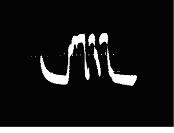 Fig. 4. Gli echi A-mode che Wild e Neal rilevarono da tre tratti sovrapposti di parete di intestino tenue di cane. Gli intervalli tra i picchi sulla linea di base (visibile come linea tratteggiata orizzontale al centro della figura) indicano i relativi spessori [da Ref. 26, © Elsevier. Reproduced under STM Permissions Guidelines with proper acknowledgment].