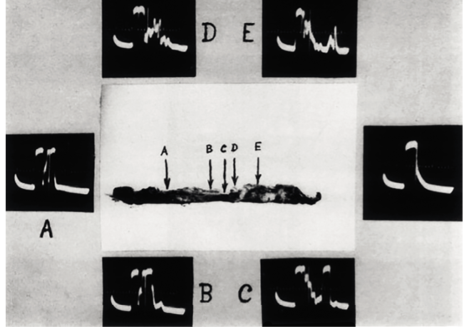 Fig. 5. Pezzo operatorio di parete gastrica con ulcera carcinomatosa. Le lettere (A-E) indicano i punti di rilevazione degli echi A-mode riportati nei riquadri. Si osserva un progressivo ampliamento dell’intervallo tra gli echi, che aumenta dalla zona normale (A) a quelle infiltrate e tumorali (B-E), indicativo di un rallentamento nella propagazione ultrasonora [da Ref. 26, © 1950 Elsevier. Reproduced under STM Permissions Guidelines with proper acknowledgment].