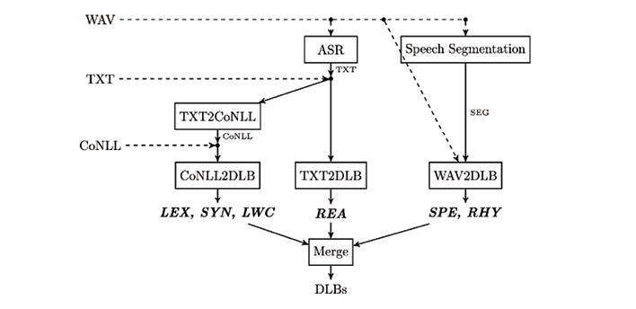 Dato un tipo di input specifico – ovvero un file WAV, TXT o CoNLL – la pipeline calcola “a cascata” tutti i DLB che possono essere derivati da esso. Il set più ampio si ottiene fornendo la registrazione vocale (da sola o accompagnata dalla trascrizione manuale, per evitare eventuali errori prodotti dal modulo di Automatic Speech Recognition descritto poco più avanti): per ampiezza e ricchezza di indici estraibili, nonché per applicabilità a contesti clinici reali, è indubbiamente questo il setting sperimentale ideale nell’ottica di creare uno strumento idoneo allo screening di massa.