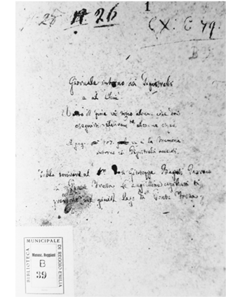 Fig. 2. Presso la biblioteca Antonio Panizzi di Reggio Emilia sono conservati i numerosi manoscritti che Nicolò Spallanzani, fratello di Lazzaro e suo erede, cedette alla Comunità della città. Fra questi, come si vede dall’immagine, vi è un corposo manoscritto dove lo scienziato scandianese andava prendendo appunti durante la sua ricerca sul volo cieco dei pipistrelli, il suo giornale di lavoro. L’intestazione porta come titolo: Giornale intorno ai pipistrelli e ai Chiù.